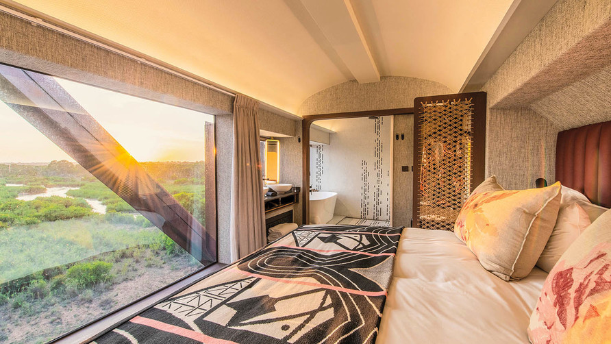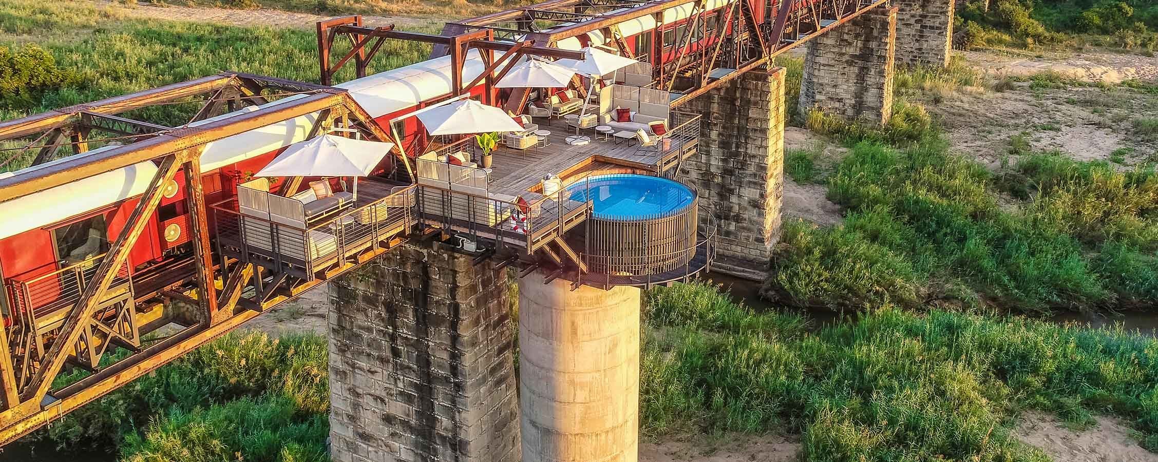 „Ein einzigartiges Luxushotel im Kruger-Nationalpark ist Kruger Shalati – The Train on the Bridge. Auf der historischen Selati-Brücke über dem Sabie-Fluss wurden alte Zugwaggons zu stilvollen Suiten mit bodentiefen Fenstern und Blick aufs Wildlife umgebaut. Highlight ist der Infinity-Pool auf der Brücke. Hier verbindet sich die Eleganz der 1920er-Jahre mit afrikanischer Kunst und modernem Komfort – ein unvergleichliches Safari-Erlebnis, das Geschichte, Natur und Luxus vereint.“