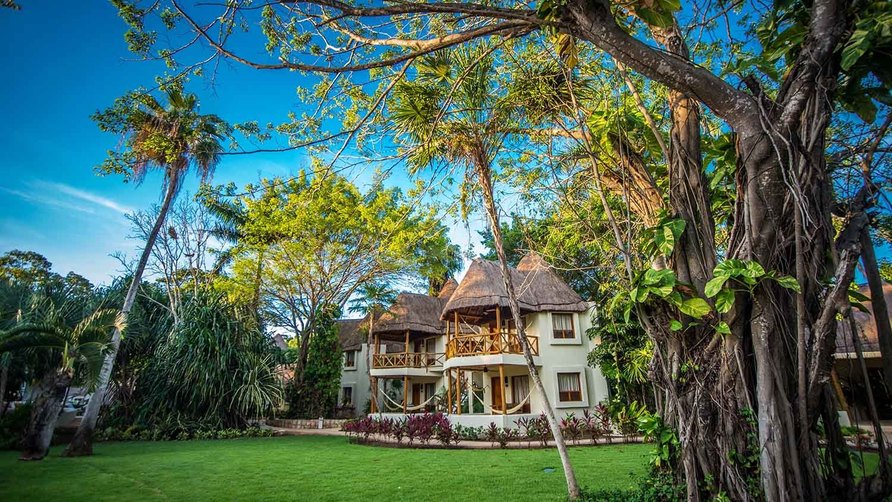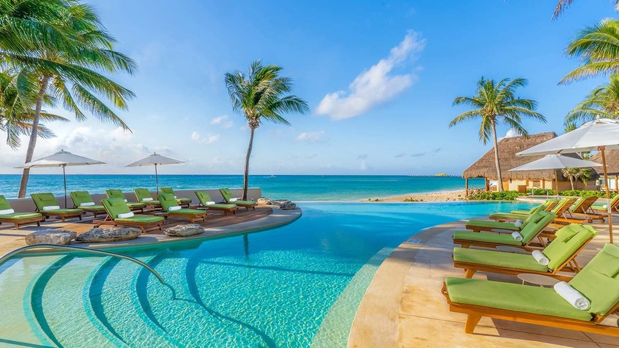 „Das Mahekal Beach Resort in Mexiko, direkt am Strand von Playa del Carmen, besticht durch seine behutsame Bauweise mit Palmenstämmen und -wedeln und ist von einer großen tropischen Gartenanlage umgeben. Die hohen, luftigen Räume haben rustikalen Charme. Kleine, liebevoll gestaltete Terrassen und private Rückzugszonen sorgen für eine ruhige Atmosphäre.“
